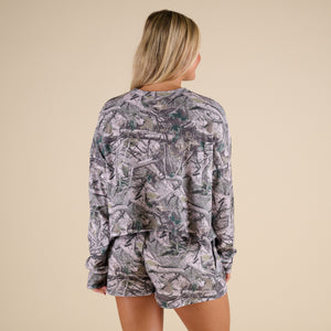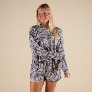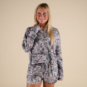Cozy up in the Woodlands Grey Camo Long Sleeve Henley — a soft, lightweight knit top designed for lounging, layering, and everyday comfort. Featuring an allover woodlands camo print and a classic henley neckline with wooden buttons, this relaxed top offers the perfect blend of casual style and easy comfort.