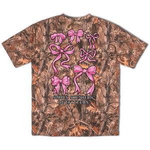 Add a touch of feminine flair to your outdoor style with the Simply Southern Pink Bows Camo Short Sleeve T-Shirt. This woodland camo tee features a back graphic of bold pink bows and a matching chest logo for the perfect mix of girly charm and Southern outdoor spirit. Made from soft cotton for all-day comfort, it’s a fun twist on a classic camo look.
