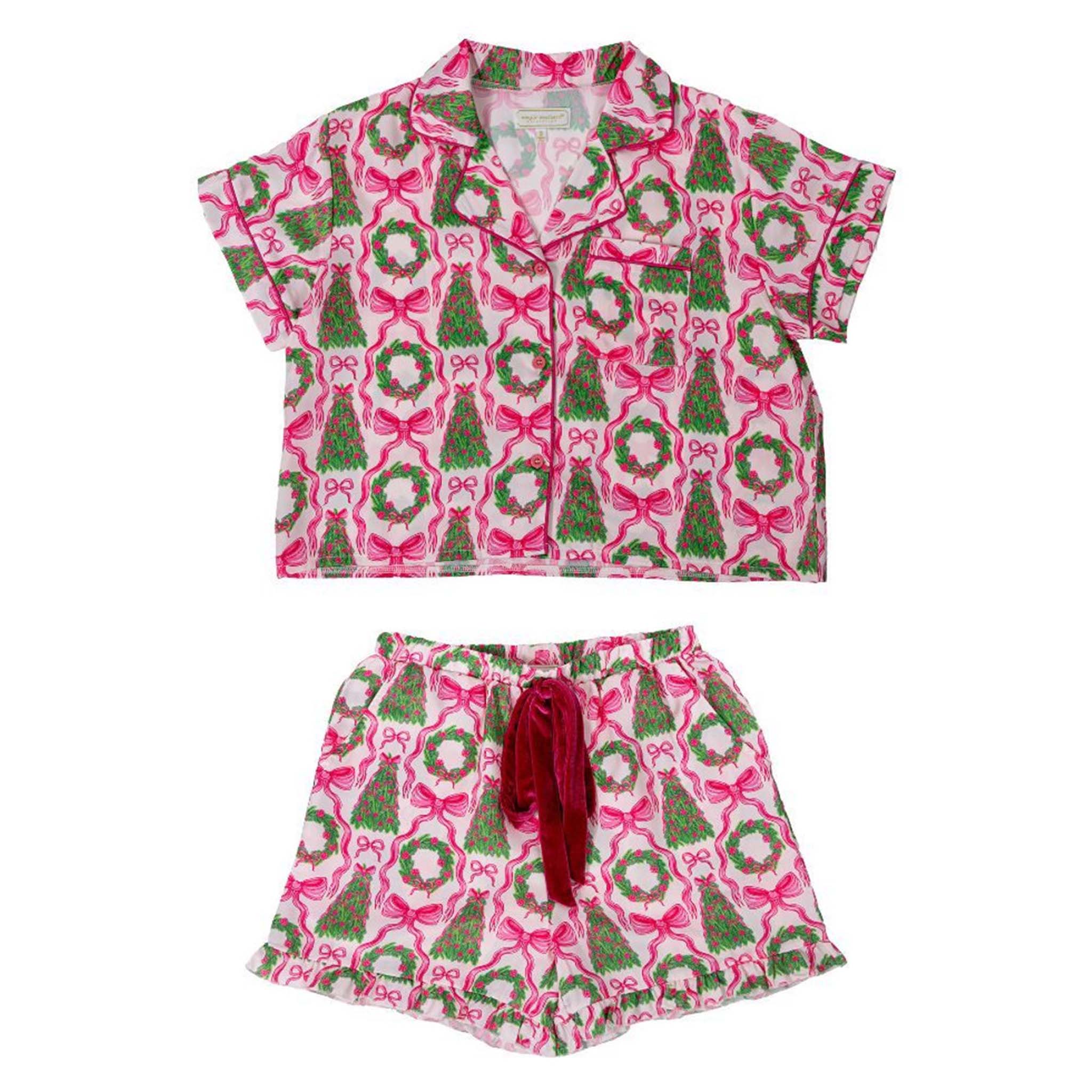 Get into the festive spirit with this cheerful Holiday Print Pajama Set. Featuring a button-front short-sleeve top and matching ruffle-hem shorts, this adorable two-piece set is covered in bright Christmas wreaths, bows, and trees in pink and green hues. Made from soft, lightweight polyester with a stretchy waistband and velvet drawstring, it’s the perfect blend of comfort and holiday charm—ideal for cozy nights, Christmas morning photos, and seasonal lounging.