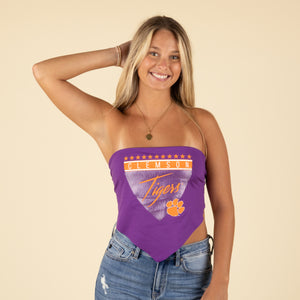 Show off your team pride in this trendy collegiate bandeau tube top! Featuring bold graphics and a flattering pointed hem, this strapless top is perfect for gamedays, tailgates, and warm-weather campus style.