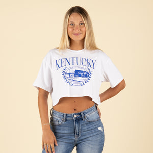 Show your school spirit in this Kentucky crop top featuring a bold front graphic of the stadium and team name. Perfect for tailgates and gameday style.