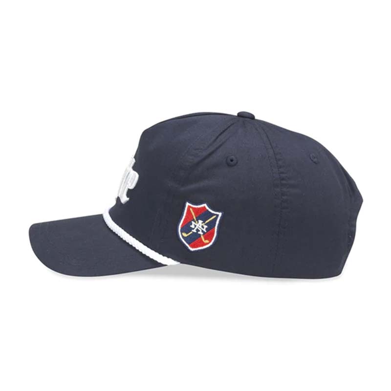 Brushed canvas crown with mesh sides and back paneling. 5 panel structured crown with curved brim and adjustable plastic snapback. Embroidered merrowed patch on front.
