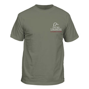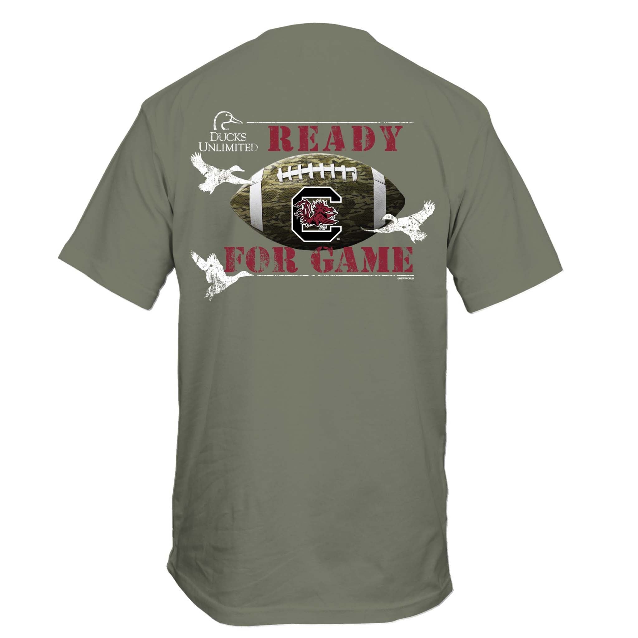 Gear up for football season with the Carolina Ducks Unlimited Ready for Game T-Shirt. This military green short sleeve tee features a small Ducks Unlimited and Gamecocks logo on the front, with a bold back graphic showcasing a camouflage football, flying ducks, and “Ready for Game” text. Perfect for gamedays, tailgates, or outdoor adventures.