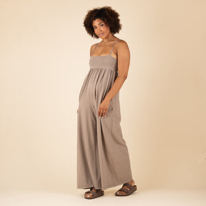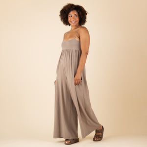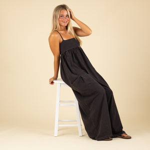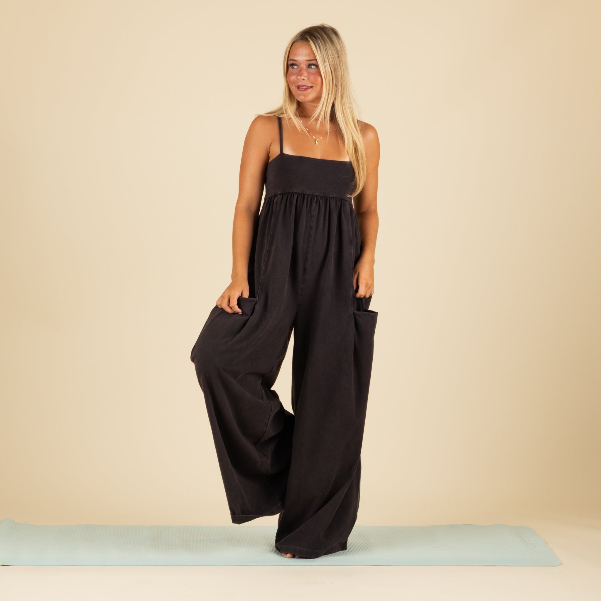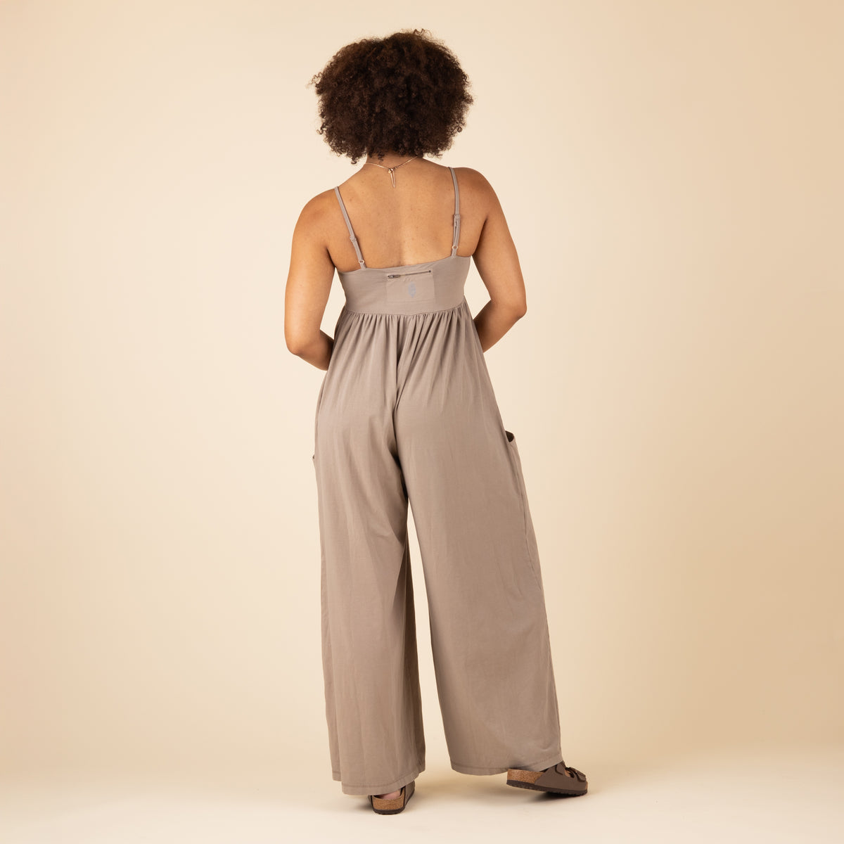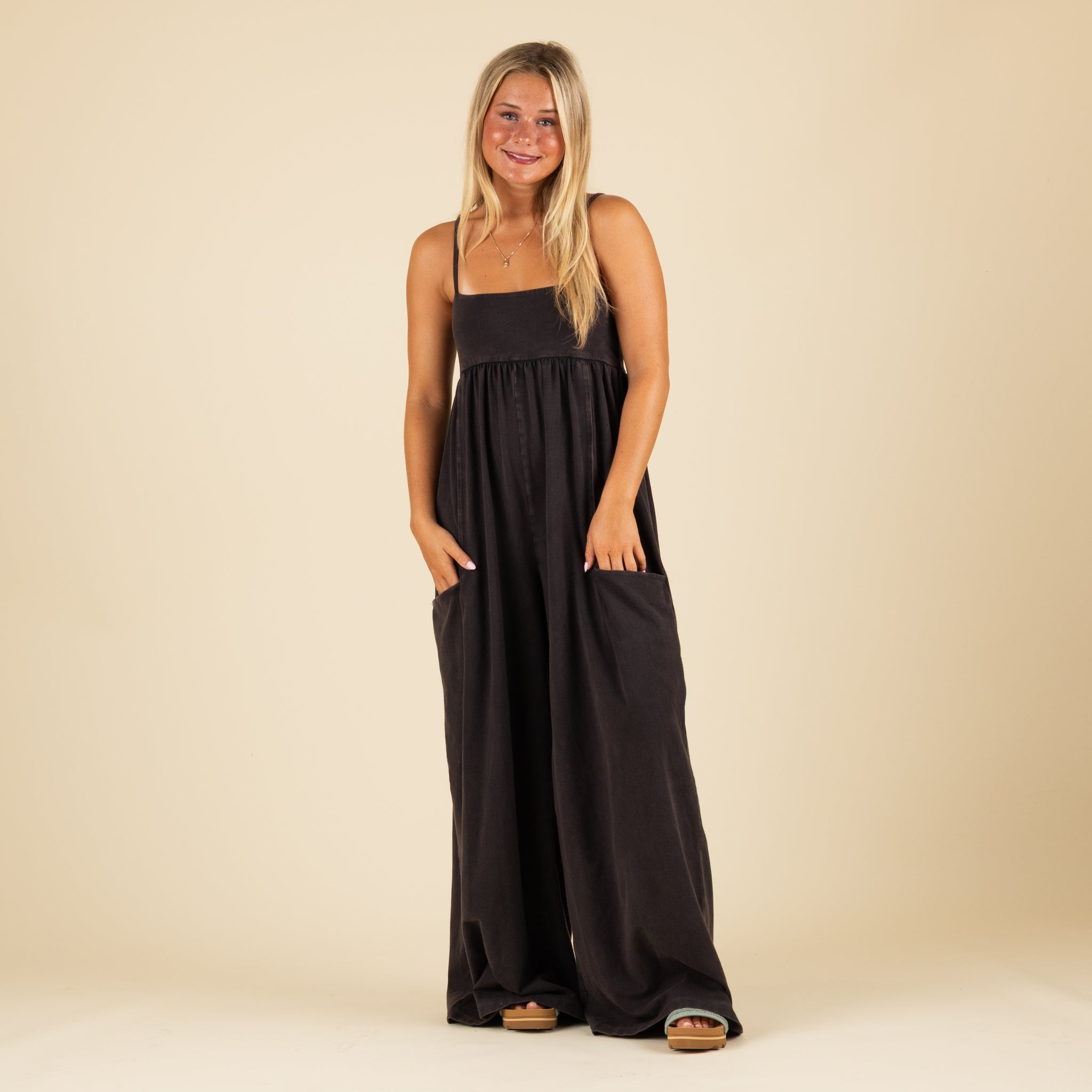 Features: Pull-on silhouette; slightly fitted, square-neck bodice; adjustable, spaghetti-style straps; pleated detailing at empire waist; slouchy patch pockets; oversized, wide legs; zipped logo pocket at back.