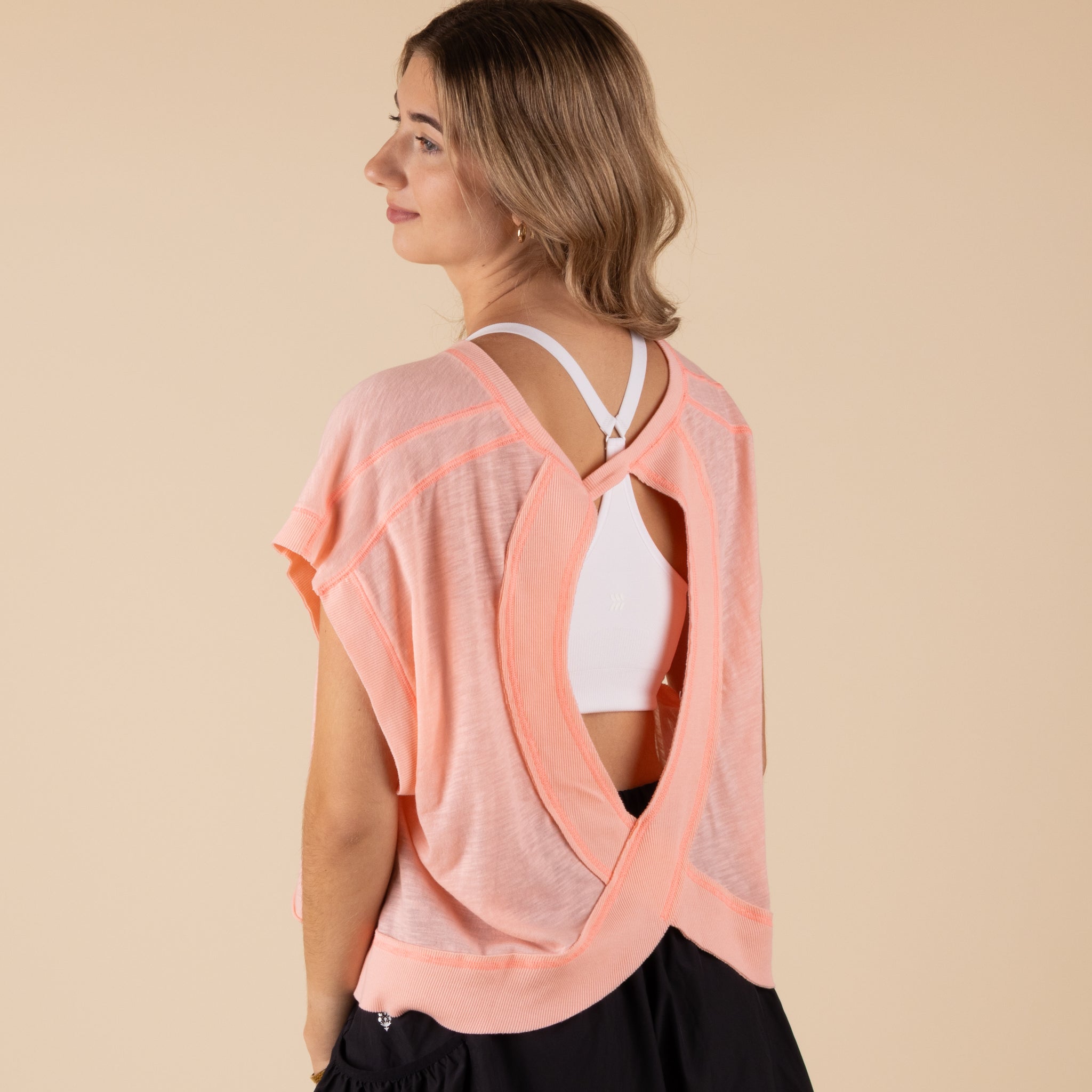 Make your next move in this light and airy layering tee featured in a slouchy design with a wrapped cutout back that’ll keep you cool through all your workouts.