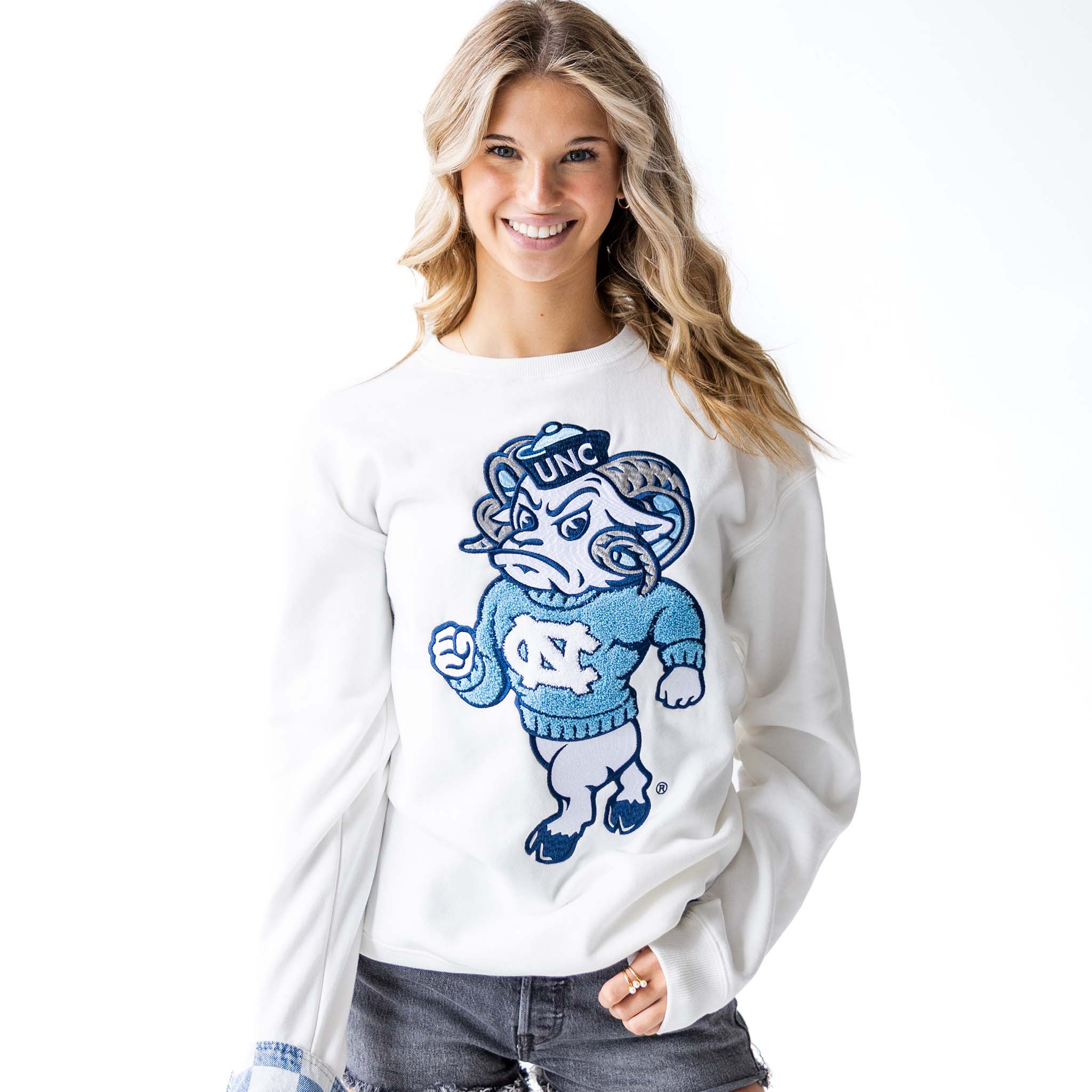 White crewneck sweatshirt with oversized UNC Rameses mascot chenille patch
