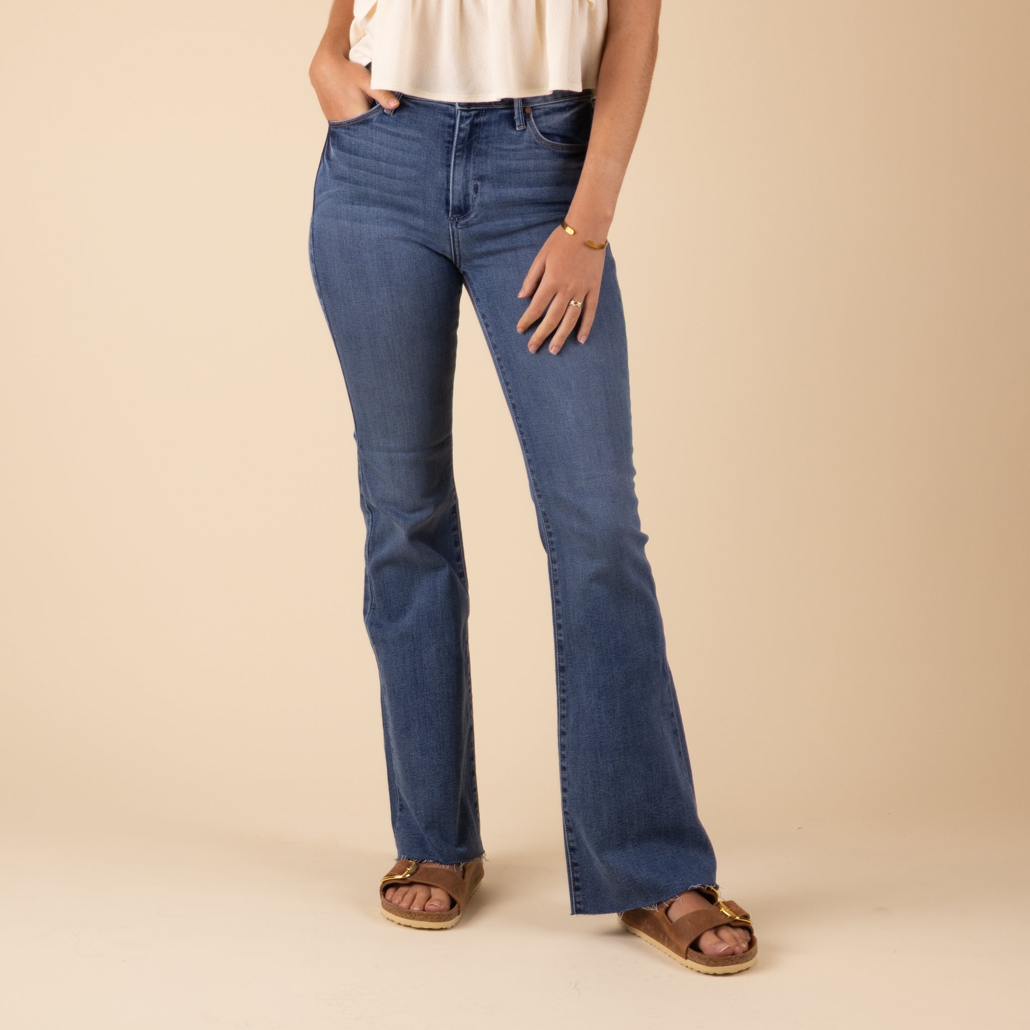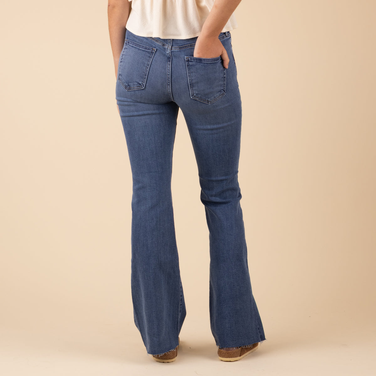 Take a break in this comfortable flare jean that features a trendy scissor hem. Hi-waisted and no distressing ensures this style goes with you anywhere you go!