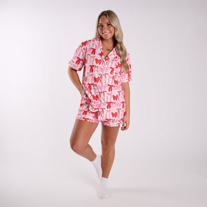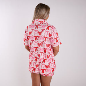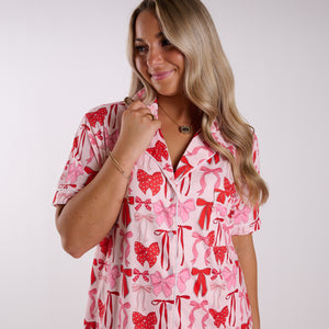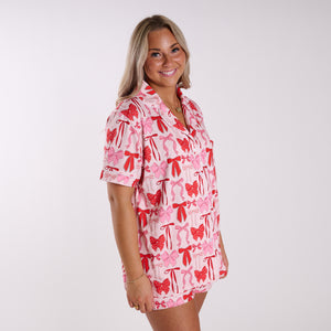 Sweet and comfy, the Katydid Pink Bows Pajama Top is perfect for cozy nights and relaxed mornings. Featuring an allover pink bow print, this short sleeve pajama top offers a lightweight feel and an easy, relaxed fit. The classic button-front design makes it effortless to wear for sleeping, lounging, or pairing with your favorite pajama bottoms.