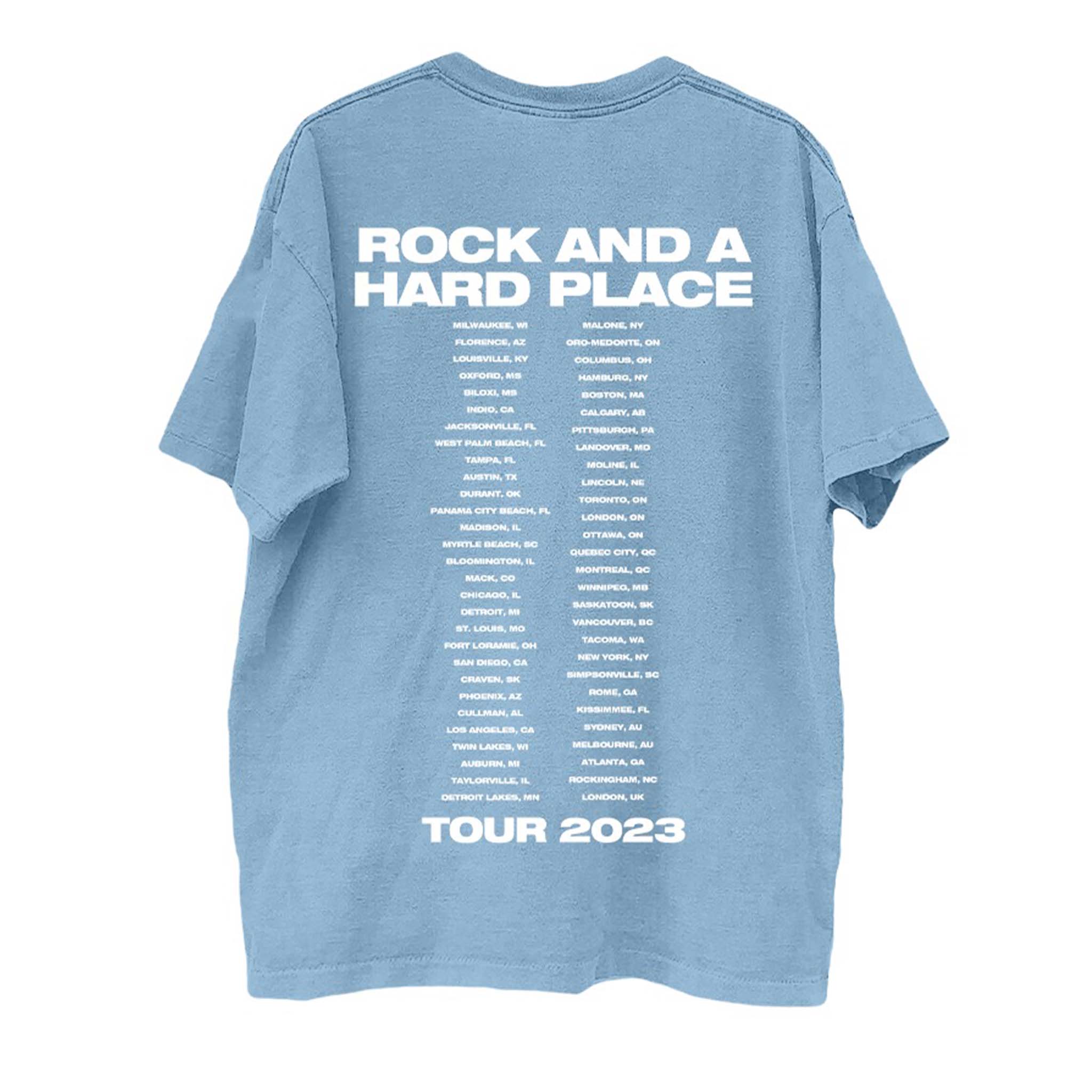 Rep your favorite country artist with the Bailey Zimmerman "Rock and a Hard Place" 2023 Tour Tee. This light blue graphic t-shirt features a bold front portrait of Bailey Zimmerman with his name in large script. The back showcases all the stops from his Rock and a Hard Place Tour, making it a must-have for fans and collectors. Made from soft cotton with a relaxed fit, this tee is perfect for concerts, casual wear, or adding to your band merch collection.