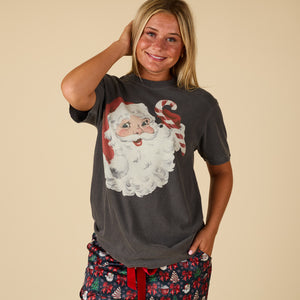 Get festive with this Vintage Santa Graphic Tee! Featuring a cheerful retro-style Santa Claus graphic holding a candy cane, this soft, washed black t-shirt adds a touch of nostalgic charm to your holiday wardrobe. Perfect for pairing with cozy pajama pants or jeans, this relaxed fit tee delivers all-day comfort and Christmas spirit in one classic look.