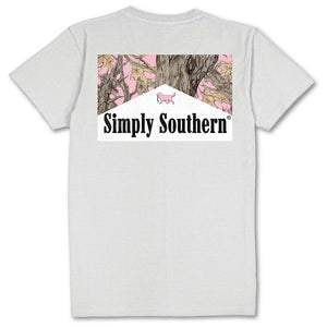 Light grey short sleeve shirt with the Simply Southern logo topped with pink camo print. Similar design on left chest.