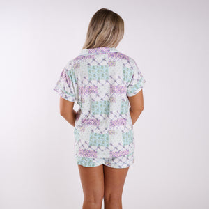 Unwind in comfort with this lightweight pajama set, designed for cozy nights and easy mornings. Featuring a classic button-up short sleeve top and matching shorts, this set offers a relaxed fit with a fresh, playful hydrangea print. The soft fabric feels smooth and breathable, making it perfect for lounging or sleeping.