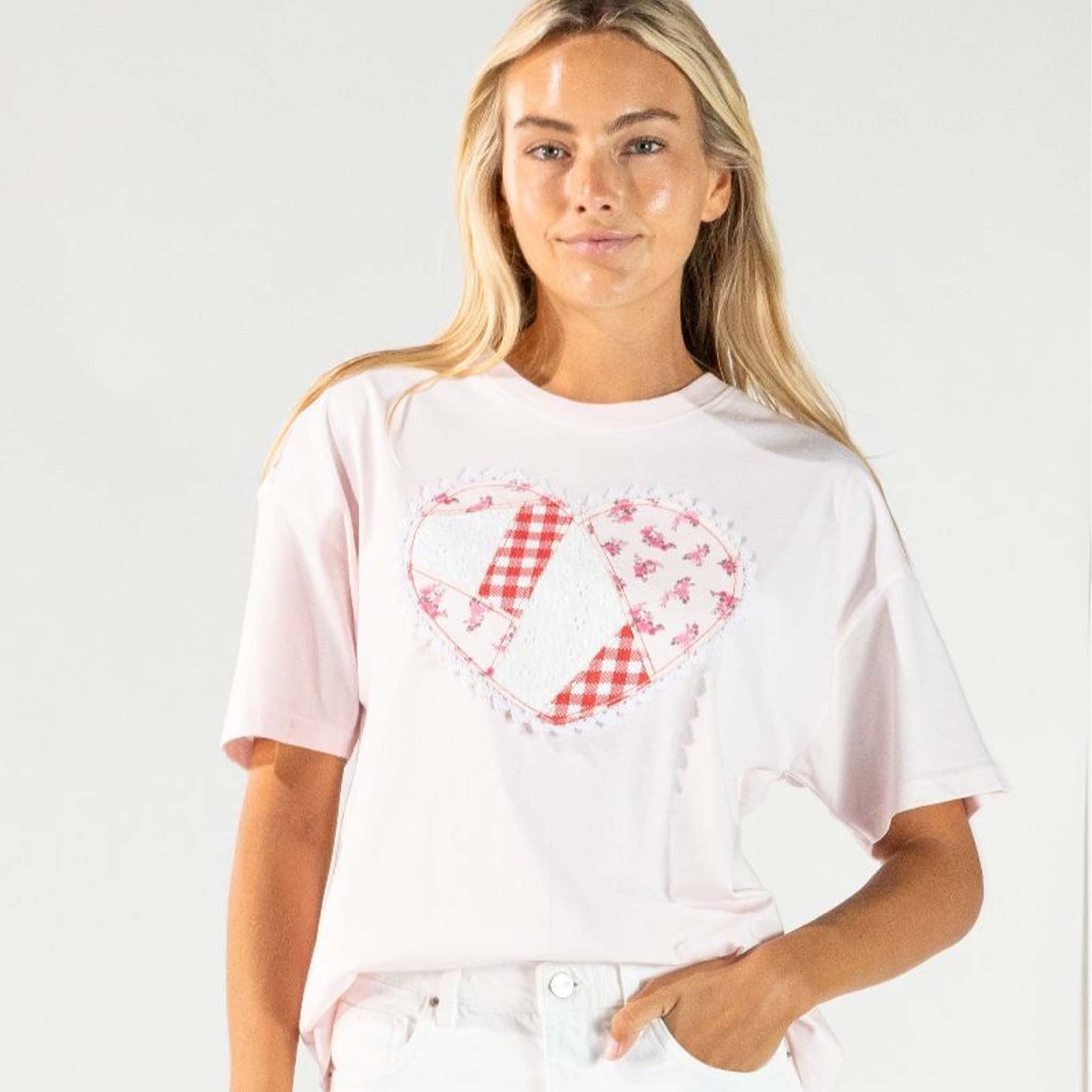 Sweet and soft with a charming twist, this Simply Southern short sleeve tee features a patchwork heart graphic with floral and gingham-inspired details. The light pink background keeps the look feminine and easy to style, while the relaxed silhouette offers all-day comfort.