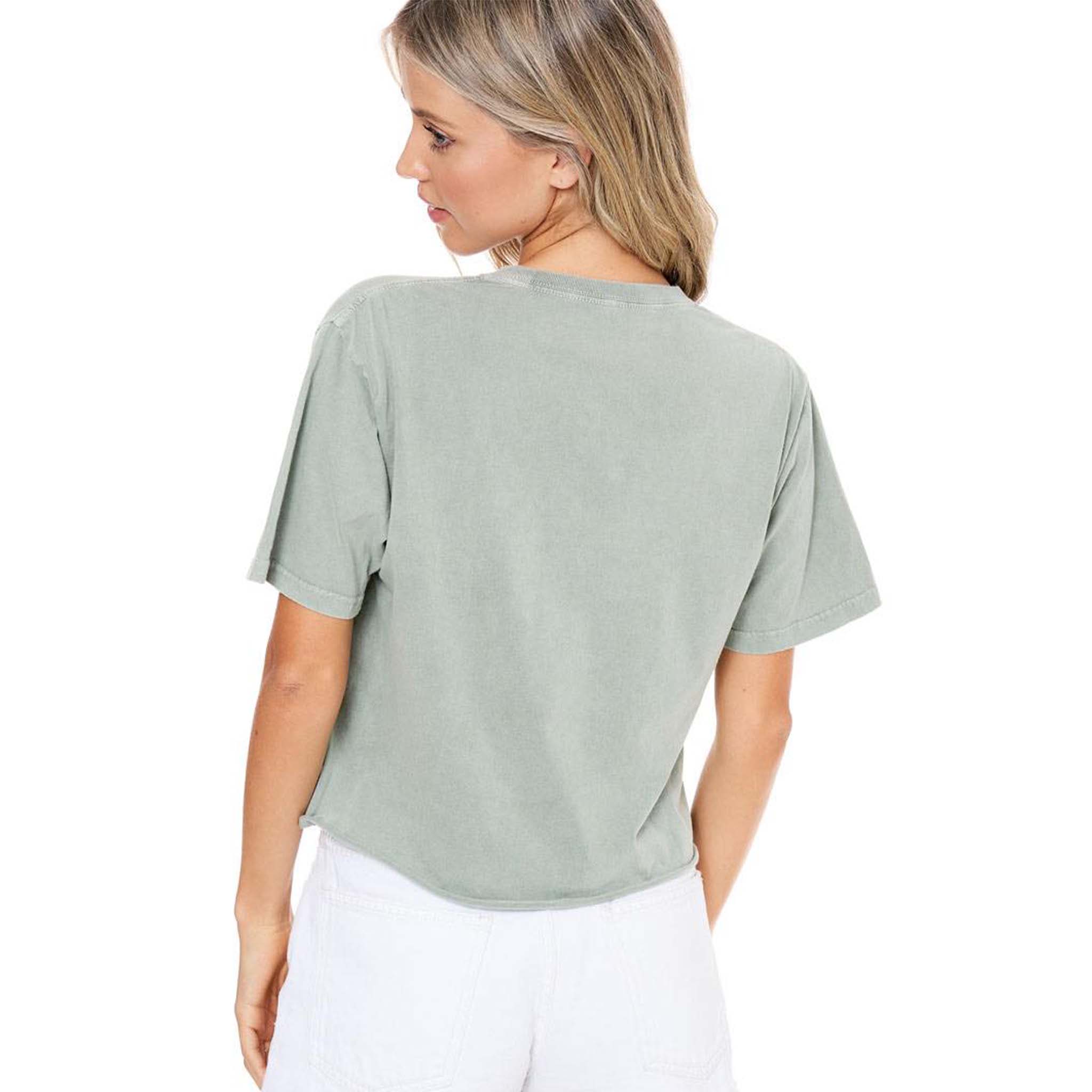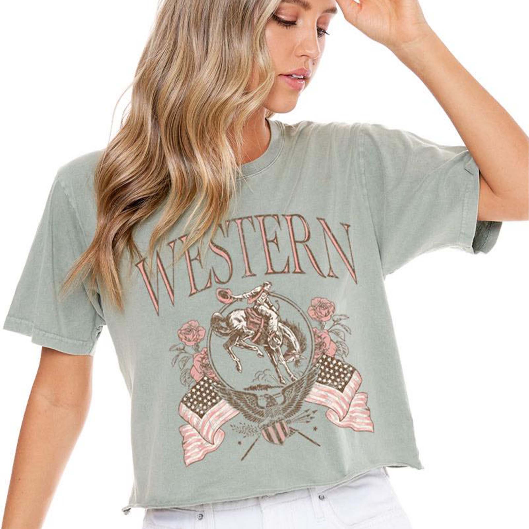 Olive green cropped tee with "WESTERN" graphic